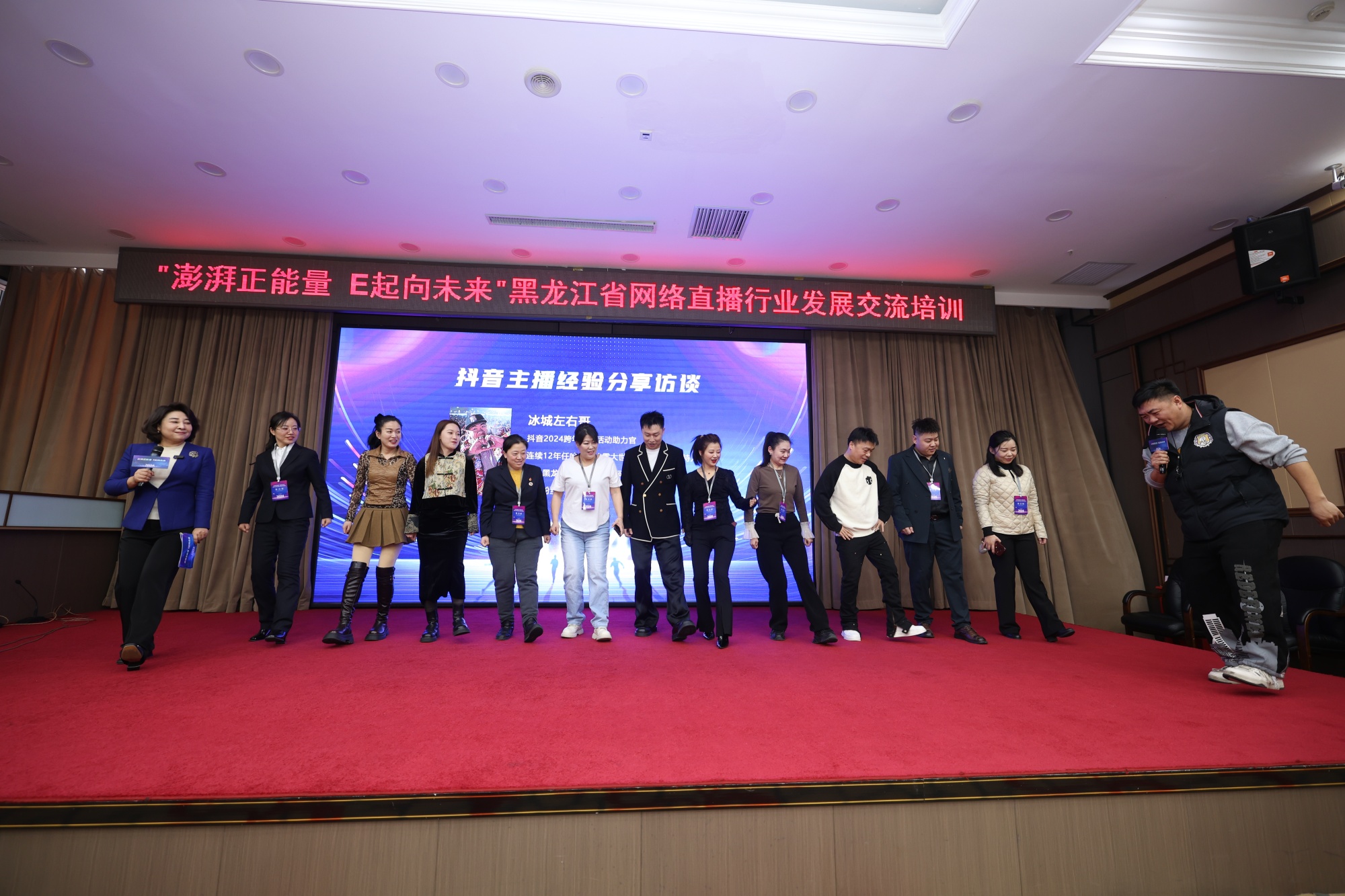 超头部主播吴召邦、视频号主播曹钢、抖音主播卢小开、疾手主播卢汉等贯串本身体验作阅历分享;主播培训机构、MCN机构、出名电商企业现场接纳访说,分享了头部IP打制的告成阅历和心得,进一步丰盛了培训行径的内在。冰城“把握哥”正在调换分享时率领与会职员跳起欢疾的“兔子舞”,现场氛围活泼,功效优越。