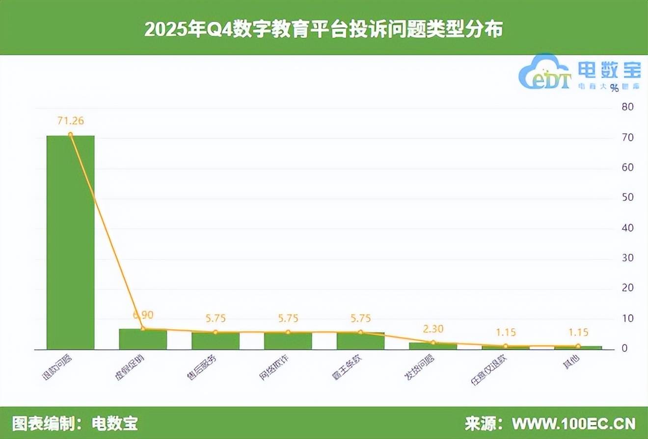 据“电诉宝”显示,2025年第四时度世界数字熏陶用户投诉题目类型有:退款题目占比最高,达71.26%;其次为作假流传,占比6.9%;排正在第三的是售后效劳,占比5.75%。别的,尚有汇集诈骗、霸王条件、发货题目、大肆仅退款等题目。