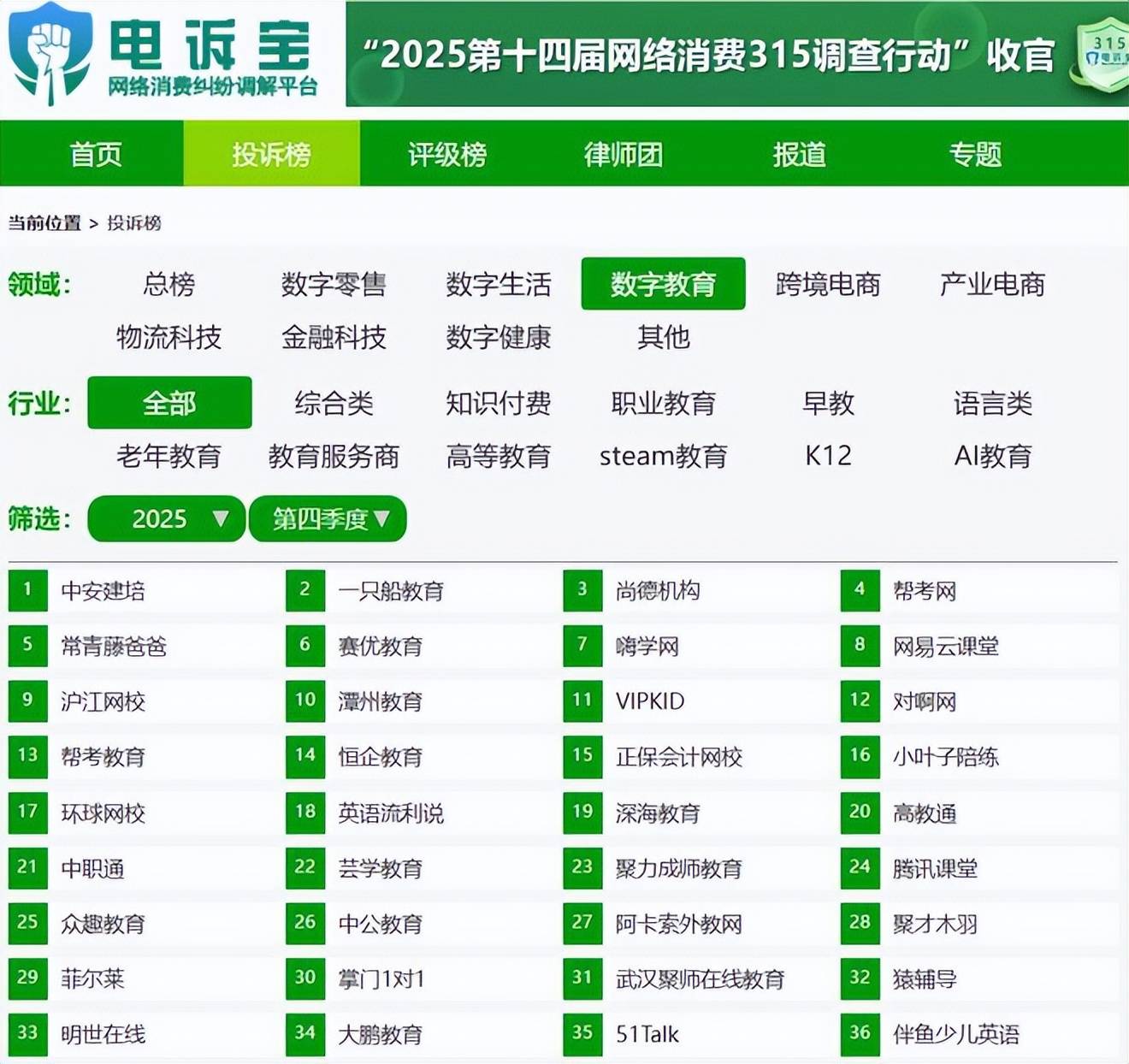 遵照“电诉宝”2025年第四时度受理的中邦数字熏陶规模用户有用投诉显示,入选投诉榜TOP10的挨次为:中安修培、一只船熏陶、尚德机构、助考网、常青藤爸爸、赛优熏陶、嗨学网、网易云教室、沪江网校、潭州熏陶。