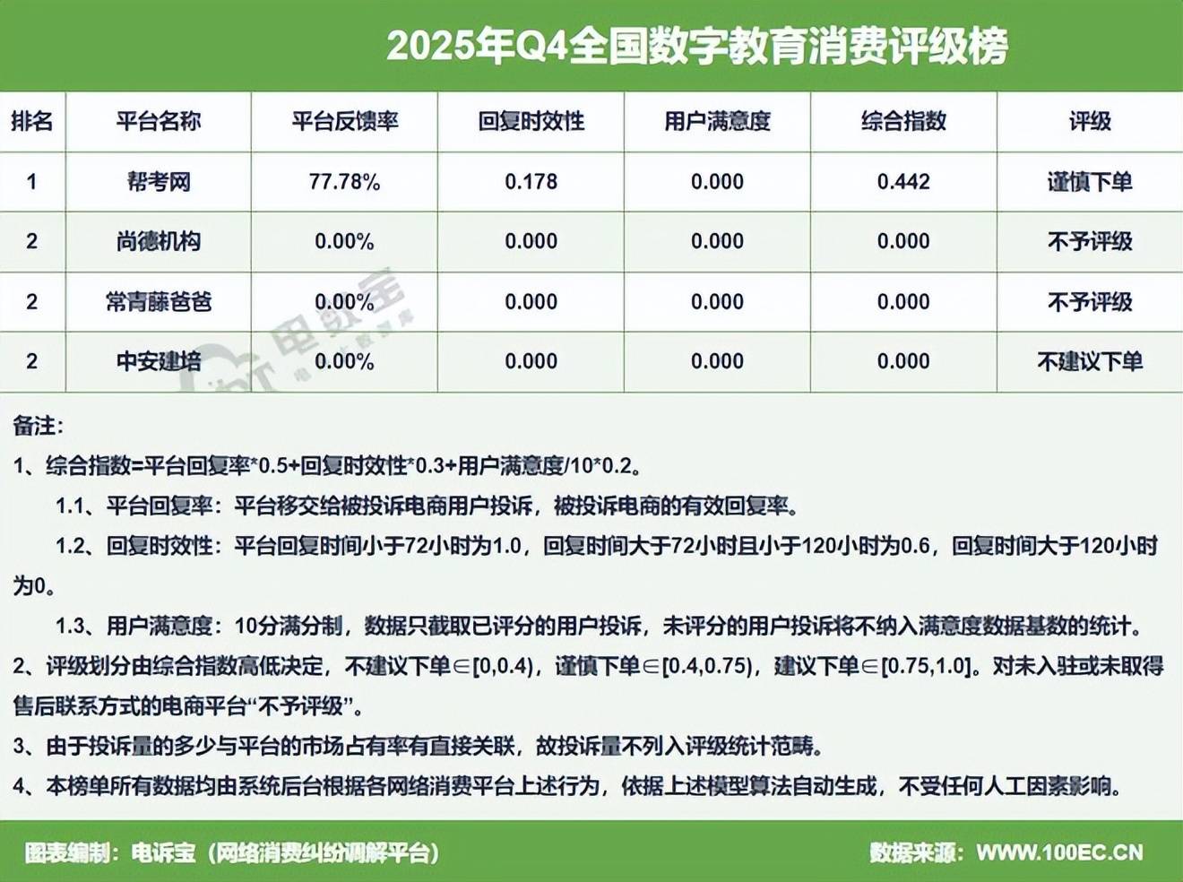 正在“2025年Q4世界数字熏陶平台消费评级榜”中,赛优熏陶通获“发起下单”评级;助考网获“把稳下单”评级;尚德机构、常青藤爸爸获“不予评级”;嗨学网、一只船熏陶、中安修培获“不发起下单”评级。